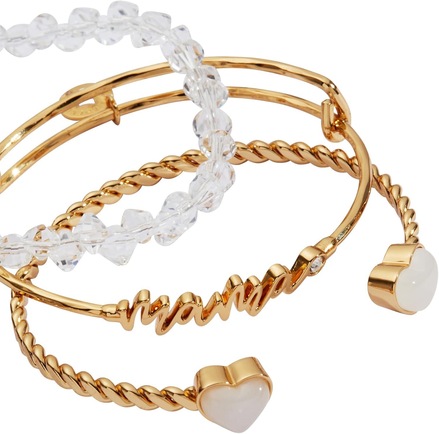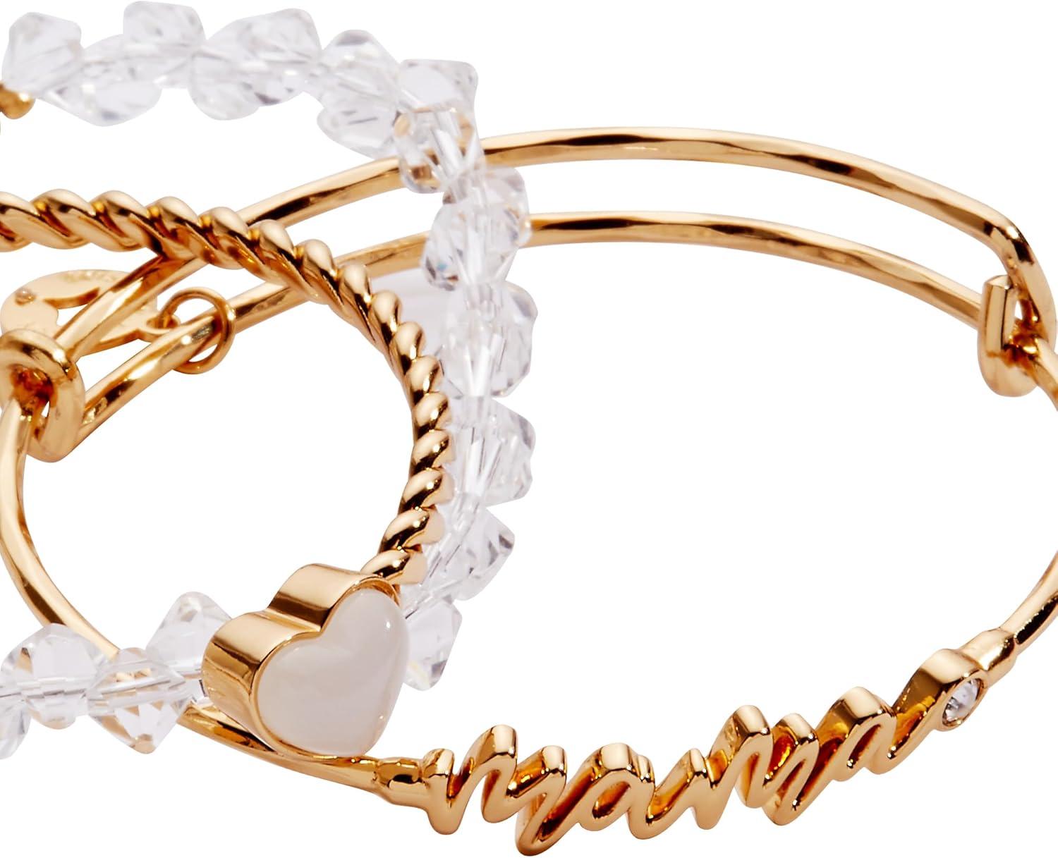Alex and Ani Mama Bracelets – Women’s Bracelets Set of 3, Expandable Wire Bangle, French Rope Cuff with Crystal Heart, Trendy Jewelry for Women(Shiny Gold)